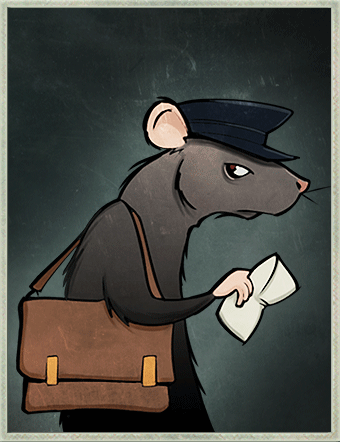 Blunt Thomas takes you around the office: a small collection room where those retrieving letters may state their business. A much larger set of back offices where newly arrived letters and parcels are collected and sorted. A dank, briny smell that never goes away, presumably because so many of the parcels spent time in the water before they arrived here. In the back room is a machine manned (ratted?) by a Postal Rat, a Rattus Faber in a pinstriped hat. It shovels sludge-damp letters into the machine's hopper and they come out dried, cleaned, pressed, and sorted into slots by size and quality of paper. |